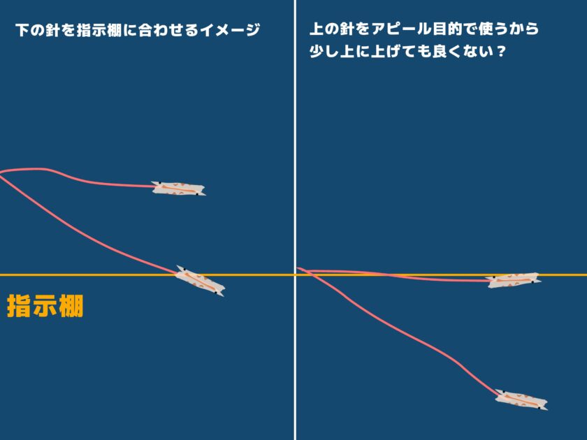 下の針に食わせるイメージ、タナを合わせるイメージでやります。